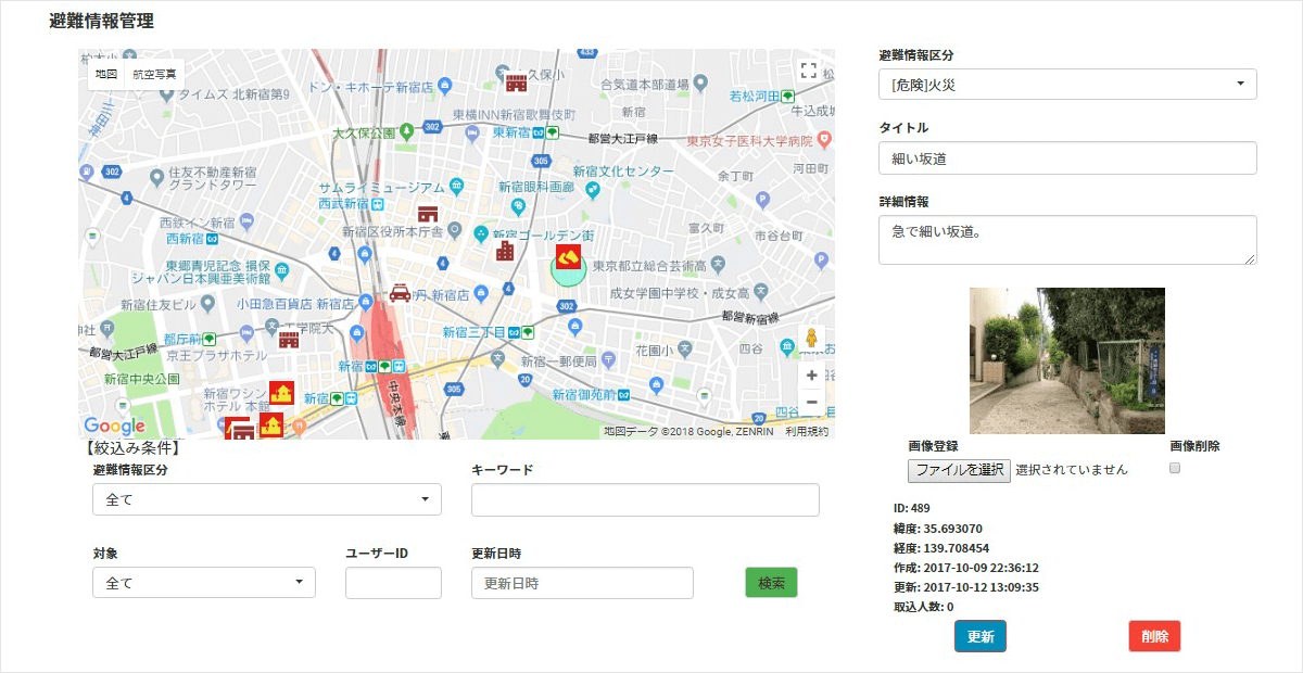 近所の危険な場所の情報はアイコンで表示されるので、危険な場所が一目でわかります。